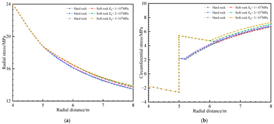 Evolution curve: (a) M-C criterion P = 2 MPa different elastic moduli of anchor bolts under radial stress along the radial distance; (b) M-C criterion P = 2 MPa different elastic moduli of anchor bolts under radial distance circumferential stress.