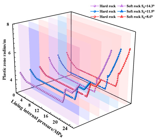 The anchoring parameters for the anchoring zone depicted in Figure 8 are Sθ = 14.3°, Sθ = 11.5°, Sθ = 8.6°, and Eb = 2 × 105 MPa. At varying anchoring angles, the initial critical pressures for soft rock are 4.73 MPa, 4.87 MPa, and 4.95 MPa, respectively, whereas the secondary critical pressures are 20.28 MPa, 20.83 MPa, and 21.42 MPa, respectively. When the pressure P falls between P1 and P2, the radius of the plastic zone is 4 m, and the entire lining is in the elastic stage. Smaller anchor support angles increase the range of the internal pressure interval represented by [P1, P2]. Correspondingly, for hard rock, the initial critical pressures are 3.13 MPa, 3.16 MPa, and 3.07 MPa, while the secondary critical pressures are 19.46 MPa, 20.16 MPa, and 20.92 MPa, respectively. When P is less than P1, the plastic zone remains inside the lining, and decreasing the angle of the anchor support exerts a minimal impact on the expansion of the plastic zone; conversely, when P exceeds P2, the first principal stress shifts from circumferential stress to radial stress. Under hard rock conditions, reducing the anchor support angle markedly inhibits the expansion of the plastic zone, with the maximum inhibition rate of the plastic zone radius reaching 5.63%. The response in soft rock anchoring zones is even more pronounced. However, as the plastic zone continues to expand, the difference in the radius of the plastic zone shows a reduction trend. The maximum plastic zone radius inhibition rate is 8.14%, while the minimum rate is 3.60%. The anchoring action of the bolts thus proves to be significantly more effective in enhancing the stability of soft rock compared to hard rock.