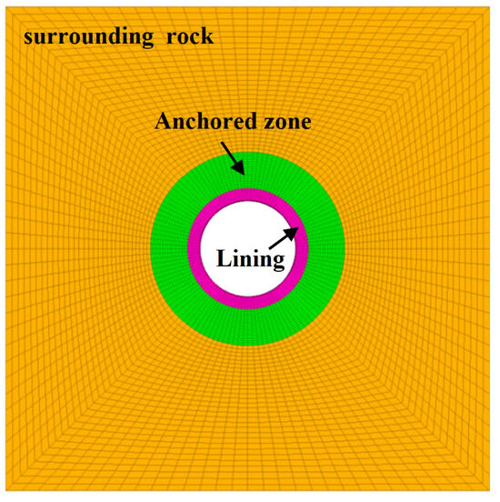 To ensure an accurate model verification, the selected model has a radius of 30 m, whereas the tunnel has a radius of 4 m. The model’s radius is six times that of the tunnel to reduce the impact of boundary constraints. The boundary conditions consist of an annular normal stress constraint and a normal displacement constraint applied to the free surface of the tunnel’s y-axis. At the outermost boundary of the model, an initial circumferential ground stress of P0 = 10 MPa is applied, and an annular internal pressure of P = 2 MPa is imposed at the inner boundary of the lining. The parameters for the lining and surrounding rock are established according to the Mohr–Coulomb criterion. The rock bolt is 3 m in length, with a radius of 0.21 m and an elastic modulus of 2 × 1011 Pa, along with a support angle of 11.4°. The constructed model is depicted in Figure 11.