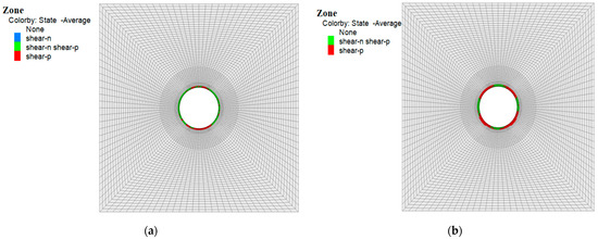 The plastic radius determined in the numerical simulation is depicted in Figure 12. According to the analysis of the elastic–plastic analytical solution of the lining-anchor support structure for surrounding rock, when the internal pressure of the lining is 2 MPa, the primary stress is circumferential, and the radius of the plastic zone should be within the lining. As shown in Figure 12, the plastic zone is indeed located inside the lining and assumes a circular ring shape due to the influence of hydrostatic pressure. The computed plastic zone radius for hard rock is 4.28 m, with a theoretical calculation error of 3.38%; for soft rock, the computed radius is 4.38 m, matching the theoretical value; and the plastic zone radius in soft rock is slightly larger than in hard rock.