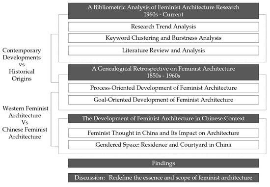 The exploration and advancement of feminism are vital for addressing critical issues such as social progress, equitable education, and healthcare access. This paper comprehensively examines the feminist movement’s impact on architecture over the past century, identifying key trends and significant areas to establish an academic foundation for feminist architecture. A literature review on feminism in urban planning, architecture, landscape design, and urban safety highlights the current research focus on feminist architectural development. Furthermore, this paper traces the evolution of feminist architecture through both purpose-driven and process-oriented approaches, exploring the interplay between feminist and modern architectural practices. It specifically examines the development of feminist architecture within the Chinese context from two perspectives: the influence of feminist thought on architecture and the evolution of gendered spaces within the “Residence and Courtyard” model. By comparing the internal logic of feminist architectural development in China and the West, this study investigates how geopolitical culture and regional differences shape the future trajectory of this field. Unlike traditional feminist architectural research, which often emphasizes women’s practices within specific feminist ideologies or focuses on visual culture and psychological interpretations of gendered spaces, this paper redefines the scope of feminist architectural studies through a comparative analysis of historical and contemporary contexts, and Eastern and Western perspectives, employing a systematic genealogical approach.