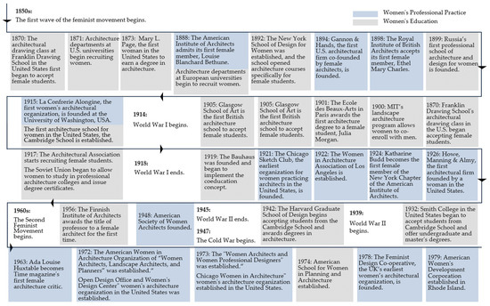 Timeline of women in architectural education and public practice.