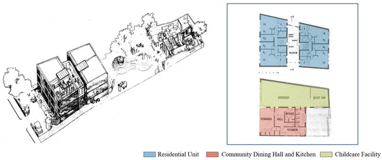 In the design of residential buildings, this change is manifested through the clustering and integration of service facilities. Since the Industrial Revolution, the transformation of social and economic structures has altered traditional family relations. Material feminists advocated for the Community Cooperation Concept, focusing on the socialization of domestic labor. These primarily consisted of cooperative housekeeping groups, like the Homesgarth residential project (Figure 9) [78]. Improvements and innovations in modern kitchen spaces also played a significant role. Material feminists’ focus on domestic spaces spurred in-depth research into kitchen design. American designer Catherine Beecher pioneered kitchen design by analyzing women’s needs and using ergonomics to improve kitchen layouts, reducing labor time [79]. Her designs are considered precursors to modern kitchens. Later, the kitchen became a focal point in feminist architectural studies, with pioneers like Christine Frederick and Margarete Schütte-Lihotzky leading innovations in kitchen workflows and furniture design [80]. Later on, with the rise of the second feminist movement, material feminists began to advocate equal rights and responsibilities in professional and family life. In the 1960s, Dolores Hayden’s Homemakers Organization for a More Egalitarian Society (HOMES) aimed to create work opportunities within residential areas. HOMES featured daycare and domestic service centers, meeting community needs and providing employment for women, thus socializing domestic labor. Nina West’s Fiona House [14] for single mothers combined housing with childcare facilities, addressing both employment and childcare needs. Organizations such as the Women’s Development Corporation (WDC) [81], founded in 1979, have developed housing projects for single mothers, designing units to accommodate women with unique identities.
