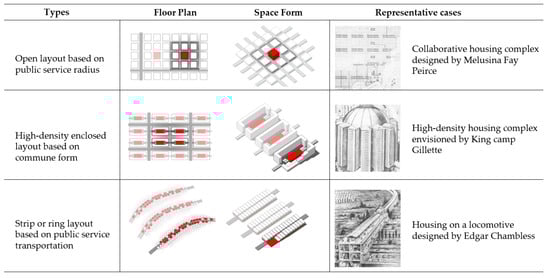 Cooperative community types based on feminist architecture. The red color on the figure represent public service facilities (kitchen, dining hall, etc.).