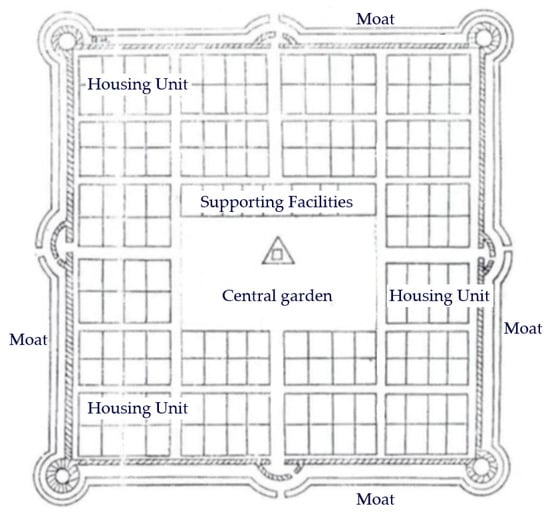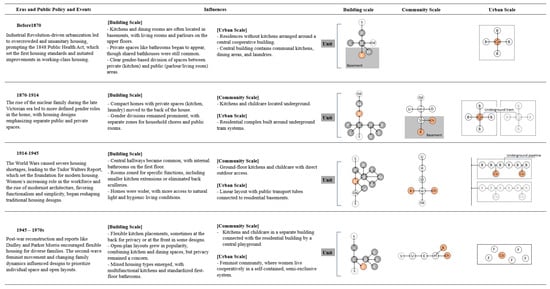 The design of women’s apartments critiques traditional residential space gender biases, aiming to create living spaces that meet women’s needs and foster a female-friendly environment. The Jane Addams Hull House in Chicago serves as a pioneering example. This social reform experiment provided accommodation, education, and community services for working-class women, significantly improving their living conditions and offering vocational training [82]. The Hull House model highlighted the potential of residential spaces to support women’s empowerment and self-sufficiency. The idea of women’s communities or community design based on feminist thinking can be traced back to late 19th-century London, where women’s groups established supportive environments to enhance women’s social status and autonomy [83]. These community designs incorporate feminist architectural thinking to separate women’s workspaces, such as childcare and kitchens, from the household. Figure 10 summarizes several community planning models based on different cooperative design concepts during this period. It can be seen that the redistribution of domestic space is still a critical factor in leading urban community planning. Radical feminists in the 1960s further advanced these ideas by advocating for eliminating traditional family functions and establishing new moral and social standards. An example is Joan Pepper’s Adobeland, a women’s community where female residents managed and operated the community, reflecting feminist principles in communal living [84]. The concept of feminist cities emerged from the 1970s feminist movement, driven by the need to address urban planning’s gender biases. Urban planner Jane Jacobs’s “Eyes on the Street” theory emphasized the importance of active street life and community involvement in improving safety and comfort and promoting gender equality [85]. Jacobs’s ideas have significantly influenced the development of inclusive and equitable urban spaces. Her emphasis on community participation and human-scale urbanism has been instrumental in creating urban environments that are safer and more accommodating for all genders.