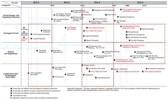 According to Marxist feminism, gender inequality is fundamentally intertwined with class society, where women’s labor in both production and reproduction is exploited and oppressed [53], and is closely connected to economic structures. In this context, the different stages of the feminist movement’s development also represent a process of liberating productivity. From this perspective, the evolution of feminist architecture in conjunction with social development can be categorized into the following stages, based on levels of productivity and the progression of social relations: the mid-19th century to the outbreak of World War I, the period from 1914 to the 1950s, and from the 1960s to the present.