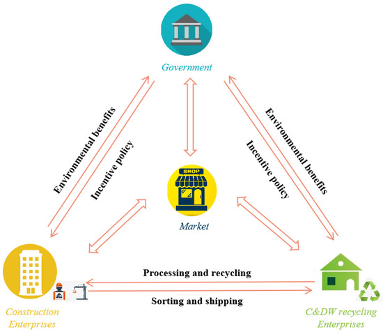 At present, stakeholders associated with C&DW management are defined as individuals or organizations involved in the waste management process [6]. The main stakeholders involved in the waste recovery process can usually be divided into three groups: government agencies, construction enterprises, and building materials production enterprises [20]. Among them, the role of the Chinese government in promoting C&DW recycling is important [19,21]. The government, as the overseer of waste management [22], can develop policies and provide financial subsidies to other C&DW stakeholders to encourage the development of the C&DW recycling industry [6]. For construction enterprises, there are several ways to deal with C&DW, including dumping C&DW in landfills, recycling, and incineration [1]. Among them, the most environmentally friendly treatment is recycling, followed by incineration, and finally landfill [23]. For building materials production enterprises, compared with directly using natural materials to produce building materials, recycling C&DW needs to collect construction waste from construction sites and transport it to reprocessing sites for reprocessing of construction waste, which is bound to increase the recycling cost of recyclers [21]. Moreover, the sale of recycled building materials is also a problem that recyclers need to consider. Hence, in pursuit of profit, recyclers can choose whether or not to recycle construction waste. Only when both the manufacturer and the recyclers choose C&DW recycling, the recycling closed-loop can be formed and the expected environmental benefits can be achieved.