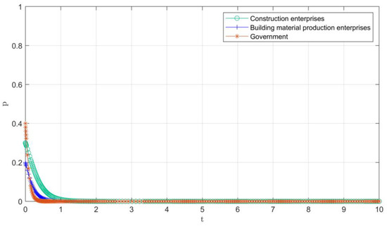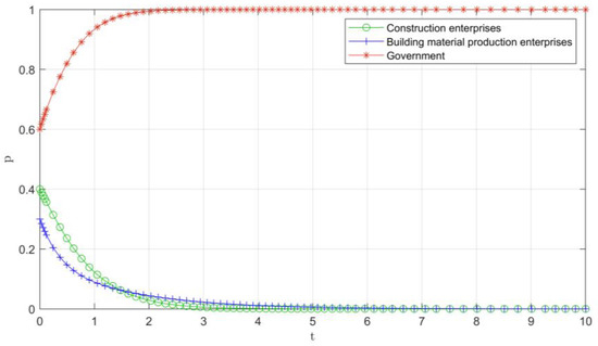 In the early development stage, the probability of government supervision, construction enterprises and building materials enterprises participating in C&DW recycling is set as 0.4, 0.3, and 0.6, and request, , , . This paper selects the set of parameters in Table 4, and the final evolution path is shown in Figure 3. Due to various social problems caused by the massive accumulation of C&DW, the government will actively participate in the regulation and control of the C&DW market, including rewarding and punishing measures for construction enterprises and building materials production enterprises to guide enterprises to recycle C&DW. So, the government arrives at “1” very quickly in a very short period of time. However, due to the influence of various factors such as the unsound regulatory channels in the early stage of the government, and high cost risks and the constraints of immature recycling technology, the enterprise finally stabilized at the “0” point after a long time of evolution. Finally, the three parties reach equilibrium at (0,0,1).