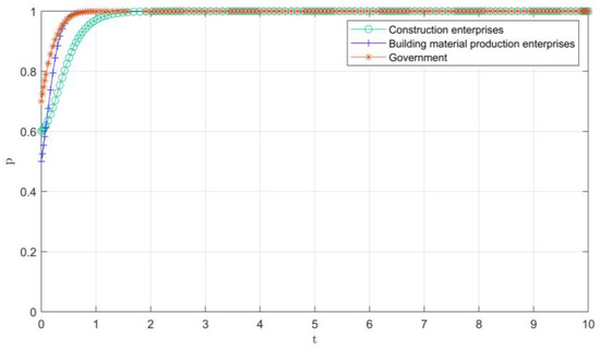 In the mature stage, the probability of active government supervision and participation of construction enterprises and building materials enterprises in C&DW recovery is set as 0.7, 0.6, and 0.8. To satisfy the system evolution path (0,1,1) in the mature stage, the parameter needs to satisfy the condition that , , . So, the research chooses the parameters set in Table 4, and the final evolution path is shown in Figure 5. At this stage, construction enterprises and building materials manufacturers reached cooperation in a short time and participated in the recycling market, while the government gradually withdrew from the market after a long period of evolution, and finally evolved into a “0” point. This shows that in the mature stage of the C&DW recycling industry, the proportion of enterprises choosing to cooperate and implement recycling strategies is increasing since C&DW recycling can bring more benefits. However, because of the perfection of the market, the probability of government regulation first rises and then slowly declines, and finally, the government behavior strategy evolves into non-regulation. Eventually, the three parties reach equilibrium at (1,1,0).