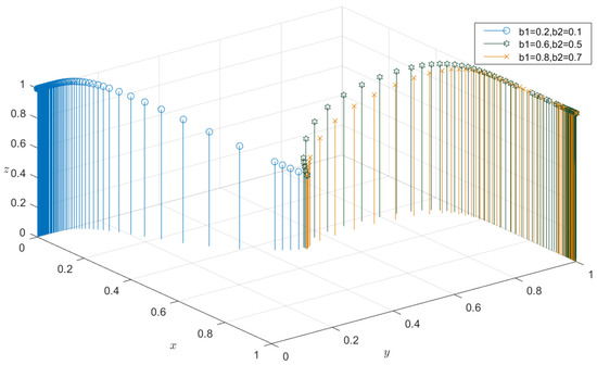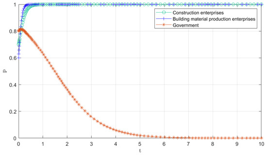 To force the enterprises to increase the willingness to participate in recycling, the administrative departments of the government impose certain punitive measures on construction enterprises and building materials production enterprises. Here, set ,; , ; and , to the corresponding value of the penalty coefficient. In this case, the government’s punishment is relatively small, and construction enterprises tend to choose illegal disposal of C&DW for their own interests. For building materials production enterprises, the profits from the production of natural building materials are enough to offset the fines for not implementing resource recycling. Figure 8 shows the impact of coefficient of penalties on stakeholders. When the penalty coefficient increases to and , the stable strategy of construction enterprises and building materials production enterprises gradually becomes implemented. Moreover, with the increase in government punishment, the effect is more obvious.