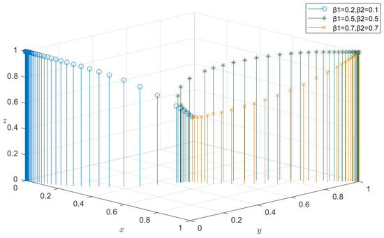 Let F(x) = 0, F(y) = 0, F(z) = 0, the research can obtain eight pure strategy solutions of the three-dimensional dynamic system, which are (0,0,0), (0,1,0), (0,0,1), (0,1,1), (1,0,0), (1,0,1), (1,1,0), (1,1,1), respectively. These eight equilibrium points form the boundary of the solution of the three-way evolutionary game. In addition, there exists a mixed strategy solution in the system and ; detailed analysis and calculations are provided in Appendix A.