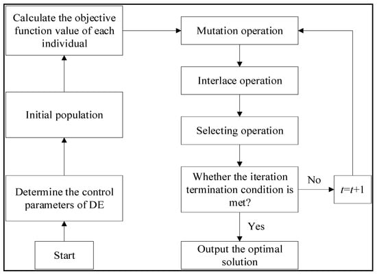 - Step 2. The initial population with the number of Np is generated randomly. The evolution iteration is set to t = 0, the boundary constraints of the parameters to be optimized are given, and the objective function values (fitness values) of each individual are calculated.