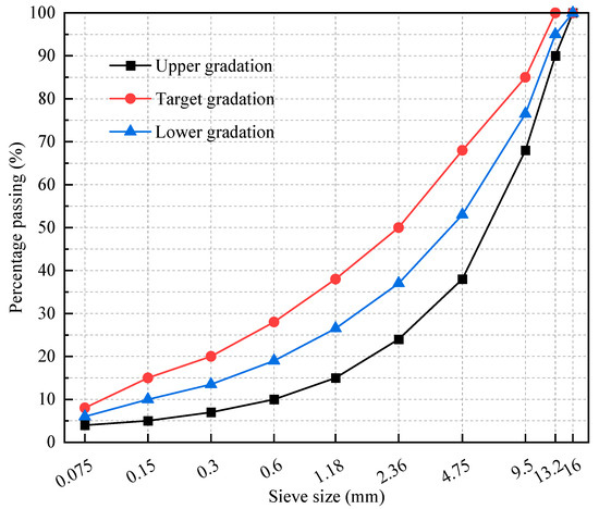 In this investigation, 70# neat asphalt was utilized. The essential characteristics of asphalt and aggregate are displayed in Table 1 and Table 2, and limestone was utilized as the aggregate. The cotton straw was first crushed using a high-speed multifunctional grinder and then soaked in sodium nitrate and sodium hydroxide solutions. Cotton straw fibers of various lengths were obtained by drying and sieving the straw after it had been soaked. Table 3 displays the fundamental characteristics of the cotton straw fiber. The grading is AC-13. The grading design curve is shown in Figure 1.