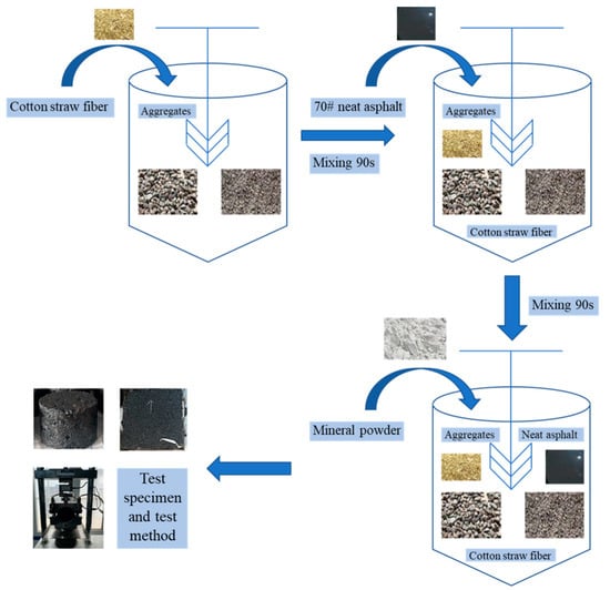 Laboratory experiments were performed in accordance with the “Standard Test Methods of Bitumen and Bituminous Mixtures for Highway Engineering” (JTG E20-2011) [21] to assess the performance of asphalt mixes treated with cotton straw fiber. To determine the mix percentage and confirm its viability, the Marshall stability test was first conducted. Using the Marshall compaction technique, specimens measuring 101.6 mm in diameter and 63.5 mm in height were created. To find the stability value, or maximum load, the specimens were loaded at a rate of 50 mm/min after being conditioned at 60 °C for about 30 min. A rutting test was performed to evaluate the mixture’s performance at high temperatures. A rolling compactor was used to create the rutting specimens, which had dimensions of 300 mm × 300 mm × 50 mm. Using a rutting tester, the test was conducted at 60 °C to determine the mixture’s dynamic stability under several circumstances. A beam bending experiment was used to assess the mixture’s resistance to fracture at low temperatures. From the rutting plates, little beams were cut into specimens that were 250 mm by 30 mm by 35 mm. The test was carried out utilizing a single-point loading technique on a UTM-100 testing machine at −10 °C and a loading rate of 50 mm/min. A freeze–thaw splitting test was used to evaluate the mixture’s water stability. Using a loading rate of 50 mm/min, specimens measuring 101.6 mm in diameter and 63.5 mm in height were evaluated in both ambient (25 °C) and frozen (−18 °C) conditions. By measuring the mixture’s splitting tensile strength both before and after freeze–thaw cycles and computing the freeze–thaw splitting tensile strength ratio, the water stability was assessed. Figure 2 is the test specimen preparation schema.