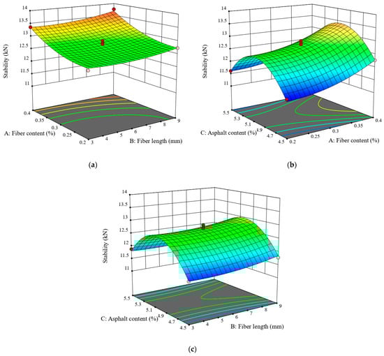 Effect of different factors on stability (a) fiber content and length (b) fiber and asphalt content (c) fiber length and asphalt content.