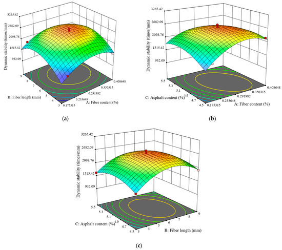 Effect of different factors on dynamic stability (a) fiber content and length (b) fiber and asphalt content (c) fiber length and asphalt content.