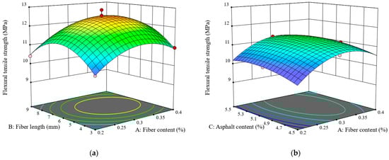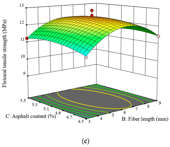 Effect of different factors on flexural tensile strength (a) fiber content and length (b) fiber and asphalt content (c) fiber length and asphalt content.