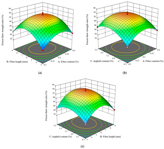 Effect of different factors on freeze–thaw strength ratio (a) fiber content and length (b) fiber and asphalt content (c) fiber length and asphalt content.
