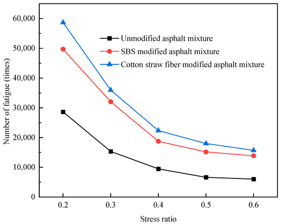 According to the test results, the fatigue life of all asphalt mixes reduces as the stress ratio rises. However, the rate of decline varies among different mixtures, with the reduction slowing at higher stress ratios. At the same stress ratio, asphalt mixes treated with cotton straw fiber have the longest fatigue life, followed by asphalt mixtures modified with SBS. At the same stress ratio, unmodified asphalt mixtures have the shortest fatigue life. These findings suggest that the fatigue performance of asphalt mixes is considerably enhanced by the addition of cotton straw fibers. This enhancement is likely due to the fibers’ ability to bridge microcracks and delay their propagation, owing to their uniform distribution in the mixture. Additionally, the fibers enhance the mixture’s adhesion and internal structure, helping to better dissipate stress during repeated loading and thus extending fatigue life [12,29]. In contrast, unmodified asphalt mixtures, which lack this reinforcing effect, exhibit poorer fatigue performance, with cracks forming and spreading more rapidly under stress, resulting in a shorter fatigue life compared to modified mixtures. Although SBS-modified asphalt mixtures also show good fatigue resistance, they are outperformed by those with cotton straw fibers. This highlights the significant advantage of cotton straw fibers in improving the fatigue performance of asphalt mixes. Overall, the indirect tensile fatigue tests confirm the effectiveness of cotton straw fiber modification, demonstrating its substantial improvement in fatigue resistance, especially under high-stress conditions.