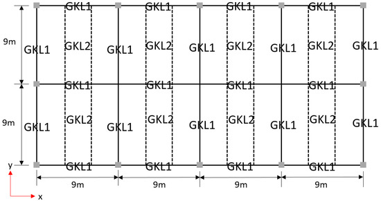 The project features a steel–concrete composite frame structure. The large-span area is shown within the framed region of Structural Plan in Figure 1. The beams are constructed from Q355B steel, with section dimensions provided in Table 1. The columns consist of concrete-filled steel tubes, also utilizing Q355B steel. The concrete with a strength grade of C60 is used within the steel tubes, the steel tube thickness is 10 mm, and the column diameter is 600 mm. The floor system is built using a steel rebar truss deck, with the floor concrete having a strength grade of C30 and a thickness of 150 mm.