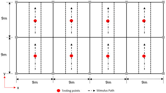 Nine measurement points were established at the mid-span of the floor slab. The stimuli were applied along the direction of y, also at the mid-span of the floor slab. The arrangement of the measurement points and the stimulus path are illustrated in Figure 3.
