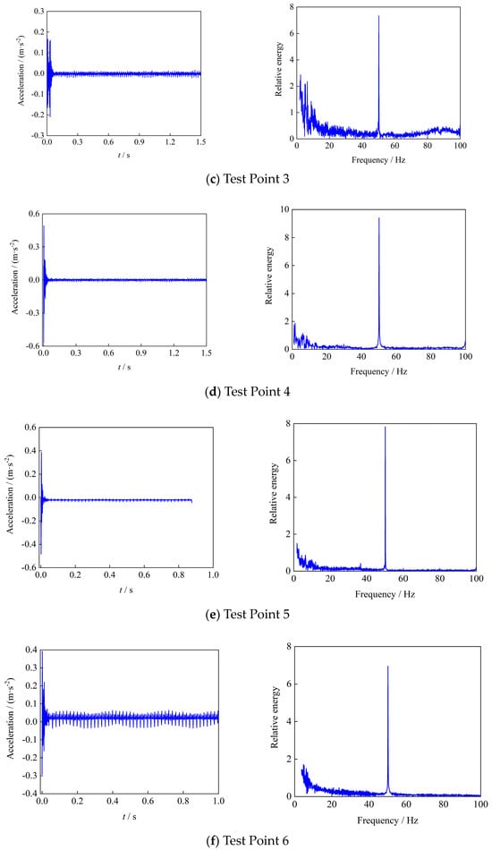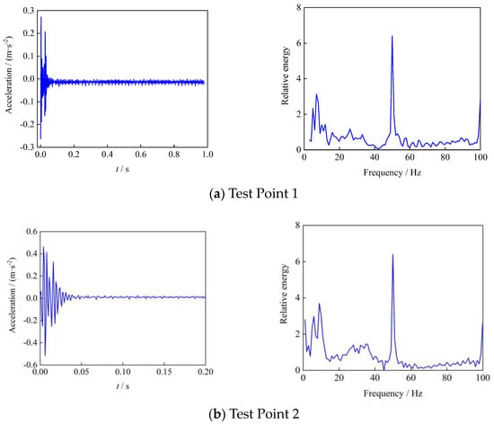 (1) The Donghua 1A401E sensor was used to collect acceleration time–history curves at the measurement points. The sensitivity setting of the sensor was set to 5.183 V/(m·s−2). This setup is illustrated in Figure 4.