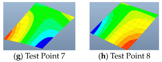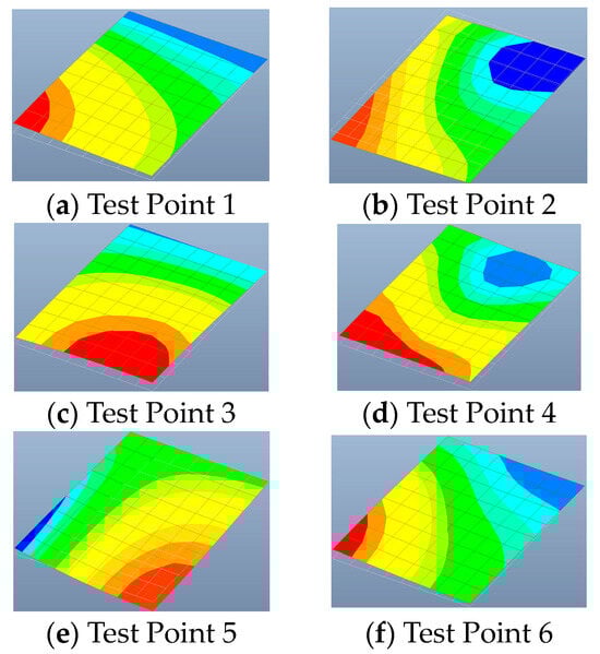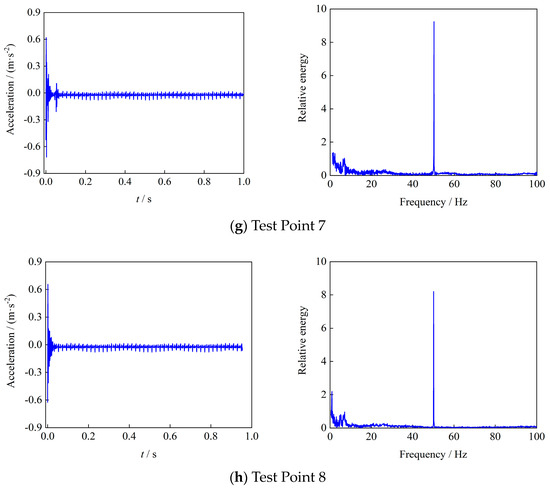 In general, testing conditions are complex and uncontrollable, whereas finite element simulations are relatively stable. The frequency results from testing are derived from the FFT method applied to the acceleration time–history curve. Even for the same point, the FFT results will not be exactly the same each time but will be close to a reference point. Therefore, the test frequency and simulation frequency cannot be entirely identical. However, when comparing the results of the eight measurement points with the simulation, the average error is only 2.99%, which is quite small, indicating that the results are reliable.