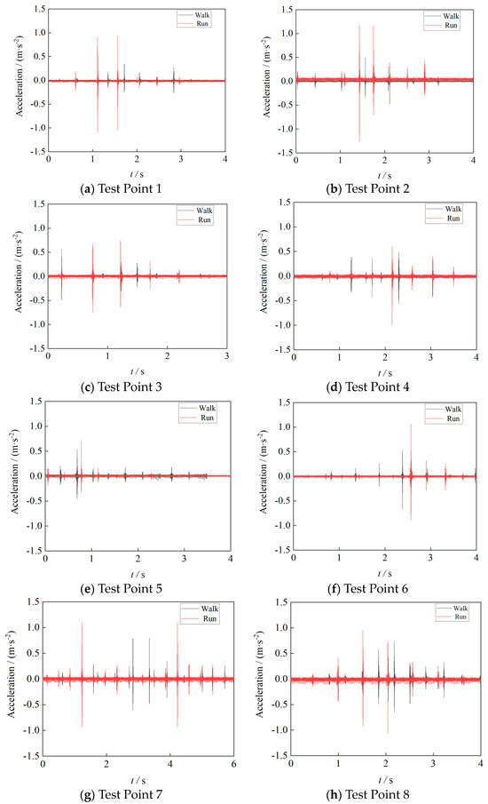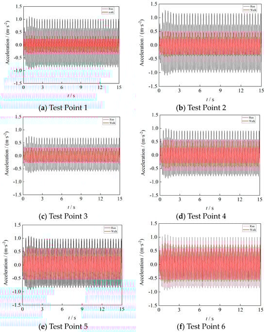 For the simulation of vertical peak acceleration, the human-induced loads were applied along the same paths and with the same magnitudes as those used in the experimental phase. The load time–history function was based on the classical Bachmann model for human-induced loads, ensuring that the simulation load cases precisely mirrored the test conditions. The acceleration time–history curves for the floor slab vibration in the test area were extracted and are shown in Figure 9.