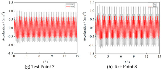 For Point 8, under walking conditions at a 95% confidence level, the confidence interval for the mean acceleration is approximately [0.0028, 0.0042] m·s−2; under running conditions at a 95% confidence level, the confidence interval for the mean acceleration is approximately [0.0025, 0.0031] m·s−2.