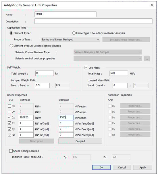 In finite element software, Tuned Mass Dampers (TMDs) are implemented through the boundary module, specifically within the sub-module for general connection properties. For instance, the parameters for TMD1, as determined from the calculations, are configured as shown in Figure 11. To avoid errors during the simulation process, a relatively small value is assigned to the rotational stiffness due to the software’s requirements. The same method is applied to configure the settings for the other TMDs.