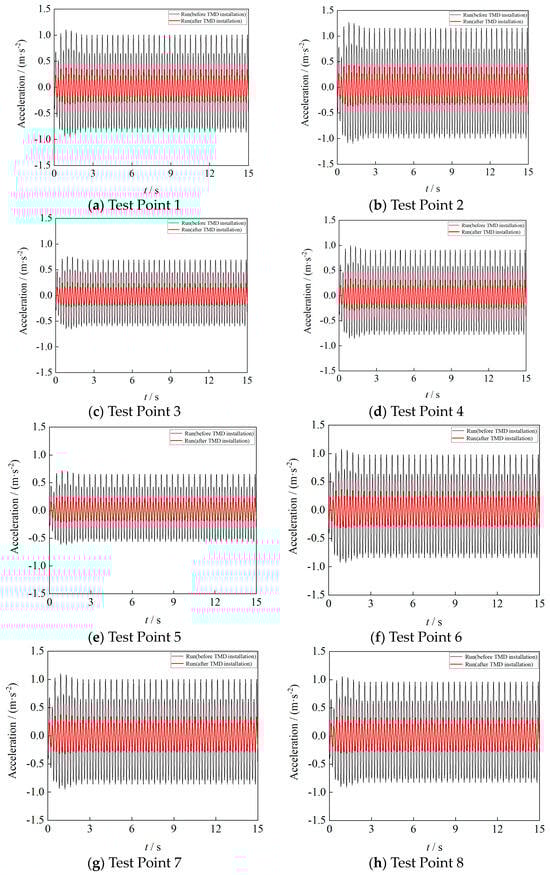As shown in Figure 12 and Table 14, the installation of Tuned Mass Dampers (TMDs) resulted in a significant reduction in vertical peak acceleration across all measurement points, with an average decrease of 65.73%. Furthermore, all measurement points now meet the standard requirement, remaining below the specified limit of 0.4 m·s−2.