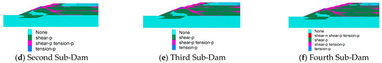Figure 5 shows that during the red mud landfill process, the area of the plastic zone did not gradually increase. The plastic zone only appeared after the completion of the initial dam and the first stage auxiliary dam construction. And only plastic zones appeared near the dam body. As the height of the dam increased, the increase in storage capacity slowed down and the dam became more stable. The distribution pattern of the plastic zone in the filling process of a red mud dam is relatively complex, and the filling process should be continuously monitored to ensure the safety of the filling project.