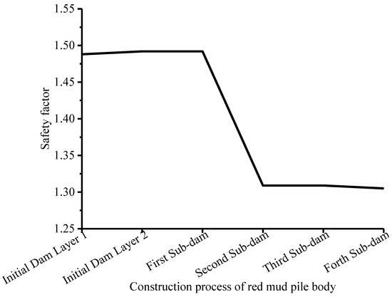 The safety factor can directly reflect the stability of the dam body during the red mud filling process. To further study the safety of the dam body during the red mud filling process, calculate the safety factors of the dam body at different stages and draw curves, as shown in Figure 6.