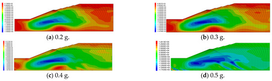 Figure 7 shows that as the seismic acceleration increases, the shear force of the red mud pile gradually increases. When the acceleration is 0.2 g, the maximum shear stress is 0.141 MPa. When the acceleration is 0.3 g, the maximum shear stress is 0.148 MPa. When the acceleration is 0.4 g, the maximum shear stress is 0.156 MPa. When the acceleration is 0.5 g, the maximum shear stress is 0.174 MPa. As the acceleration increases, the increase in shear force is 4.7%, 10.6%, and 23.4%, respectively. Meanwhile, as the acceleration increases, the maximum shear stress always appears at the bottom of the initial dam.
