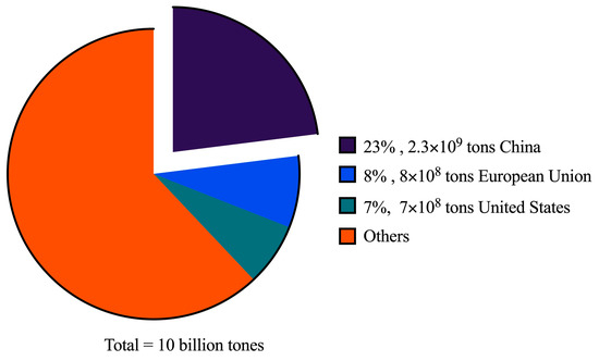 In the contemporary era, urbanization is occurring at an accelerated pace, with a projected global urbanization rate of 68% by 2050 [1]. This has resulted in the high consumption of natural raw materials and the substantial production and disposal of construction waste, leading to a multitude of ecological concerns [2]. One of the primary contributors to these issues is the manufacturing of concrete, for which natural aggregates (NAs) constitute approximately 60–75% of the total material volume. Consequently, there is a great demand for NAs, which has a detrimental impact on the sustainability of mining resources [3,4]. As shown in Table 1, the global distribution of sand and gravel production in 2022 and 2023 has increased in the majority of countries. The United States emerged as the leading producer, with output exceeding 100,000 tons per year in 2022 and exhibiting a rising trend, followed closely by China. Notably, by 2023, the mineral production of China and the United States reached approximately 60% of the global production. Additionally, Table 2 presents the global distribution of cement production in 2022 and 2023, with China holding the largest share in both years, accounting for about half of the global production. It is well documented that the rapid expansion of the cement industry will result in an increase in greenhouse gas emissions, which in turn leads to ecological problems [5]. In terms of waste generation and disposal, especially in demolition projects, it has become a topic of interest. As shown in Figure 1, China produces 1.8 billion tons of construction waste each year, representing 23% of the total global production. This is followed closely by Europe and the United States, which account for 8% and 7% of the global total, respectively, with no signs of decreasing trends [6,7].