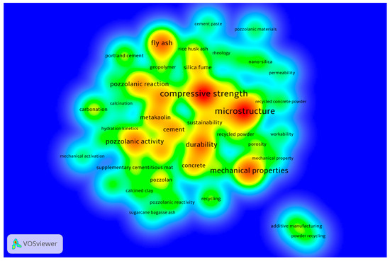 The data presented in this study were collected over a five-year period using databases such as Web of Science and Scopus. The search terms included “Recycled Brick Powder”, “Alternative Cementitious Material”, “Brick Powder Property”, and “Brick Powder Cement”, among others. The linkage map of keywords was drawn using the VOSviewer (Version 1.6.20) features “keywords co-occurrence” (as a type of analysis) and “author keywords” (as a unit of analysis), with the minimum number of keyword repetitions of 29. Consequently, out of 6646 keywords, 48 were shortlisted for the linkage map, as shown in Figure 2. It can be seen that in this field, central keywords, such as “microstructure”, “compressive strength”, “durability”, and “pozzolanic activity”, are currently the most discussed topics. Therefore, this paper provides an overview of the fundamental properties of brick powder in its original and processed states, including chemical composition, mineralogical composition, microstructure, and water demand. The properties of RBP-based cementitious materials, such as flowability, rheological properties, microstructure, setting time, pozzolanic activity index, heat of hydration, and shrinkage, are then discussed. Furthermore, the mechanical performances, durability, and microstructures of cementitious materials at varying replacement ratios of RBP, as well as different treatment methods, are comprehensively evaluated. This study provides valuable technical support for addressing the treatment of RBP and promoting the sustainable utilization of construction materials.