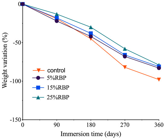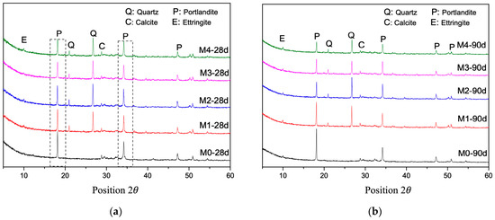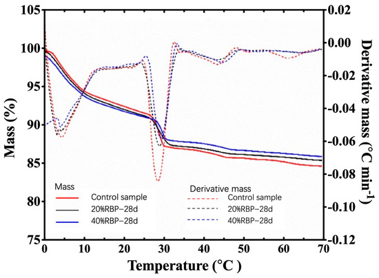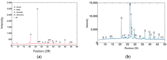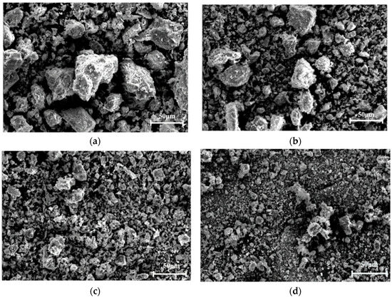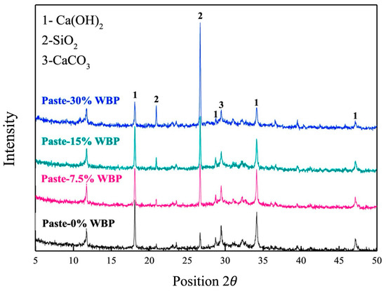 Table 3 illustrates the chemical composition of unprocessed RBP. It is primarily composed of SiO2, Al2O3, CaO, and Fe2O3, with SiO2 representing about 60.66% of the total composition. Al2O3 and Fe2O3 follow closely behind with 18.56% and 6.93%, respectively, while the content of CaO is about 4.26%. In comparison to cement, which is primarily composed of CaO and SiO2, the content of CaO in RBP is considerably less. Consequently, the incorporation of RBP will result in a reduction of OH- and impact the extent and rate of hydration of cementitious materials [36]. Nevertheless, RBP comprises a significantly greater proportion of silica than ordinary Portland cement (OPC). SiO2 is the main driver of the pozzolanic reaction, reacting with calcium hydroxide in cement to form calcium silicate hydrate (C-S-H) gel, which is a crucial component in enhancing the strength and durability of cementitious materials [37,38,39,40]. In addition, Al2O3 is conducive to the formation of calcium sulfide and improves the early mechanical properties of cementitious materials. When the total content of SiO2, Al2O3, and Fe2O3 in RBP exceeds 70%, it meets the requirements of ASTM C618-22 [41]. This makes RBP suitable as a pozzolanic material and a potential replacement for cement. However, since RBP originates from C&D wastes, it may contain organic matter. Therefore, the carbon content must be controlled to ensure the loss on ignition remains below the permissible limits, i.e., less than 6% according to ASTM standards.
