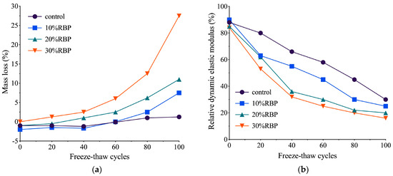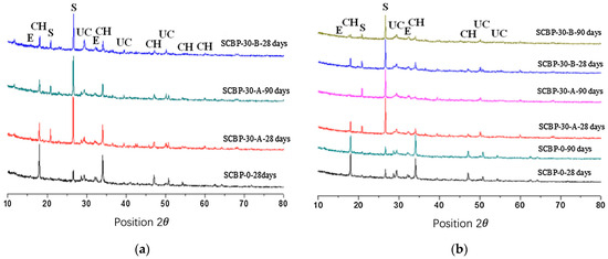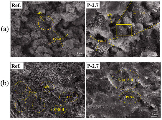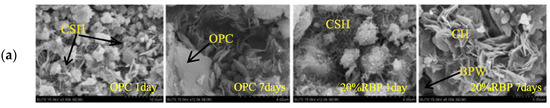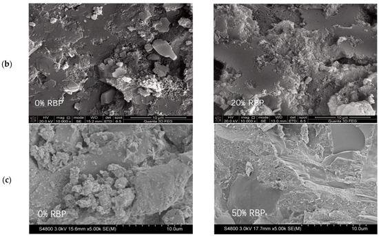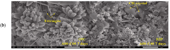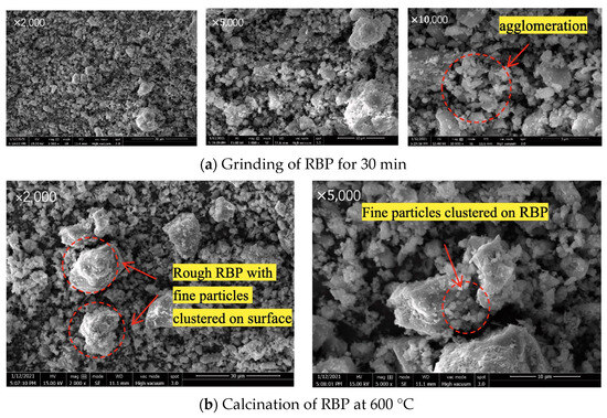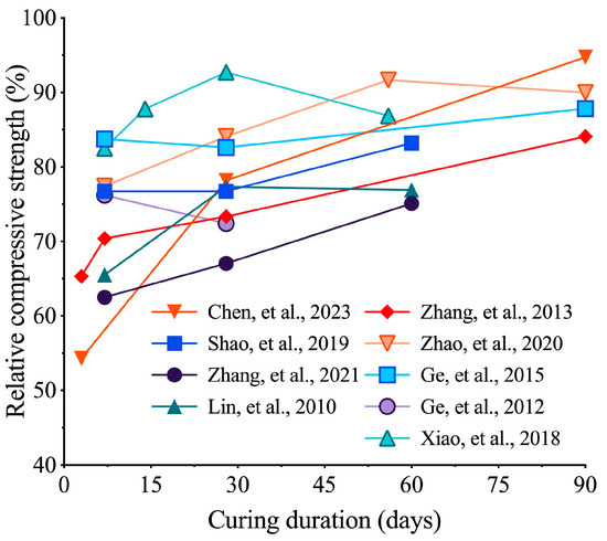 Chemical excitation is also effective in enhancing the pozzolanic activity of RBP. For example, Zou et al. [61] observed that the use of sodium sulfate (SS) can provide SO42− particles to induce the generation of ettringite (3CaO-Al2O3-3CaSO4-32H2O). Consequently, this led to improved early age mechanical properties of cementitious materials. Furthermore, experiments on the stimulation of RBP pozzolanic activity using alkalis Ca (OH)2 and Na2SiO3· 9H2O were carried out in a previous work [62]. The authors pointed out that reasonable control of the addition of alkaline exciters and increasing the alkalinity of the liquid phase can promote the chemical reactions of the active components in RBP, i.e., SiO2 and Al2O3. This process generates more hydration products and improves the chemical activity of RBP. However, it requires special care as an excessive increase in alkalinity may lead to an unfavorable alkaline–aggregate reaction.