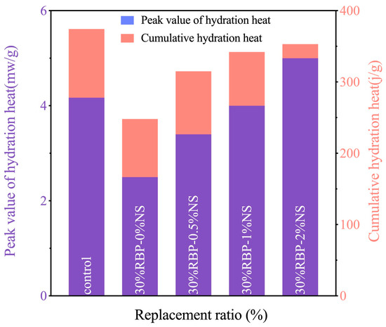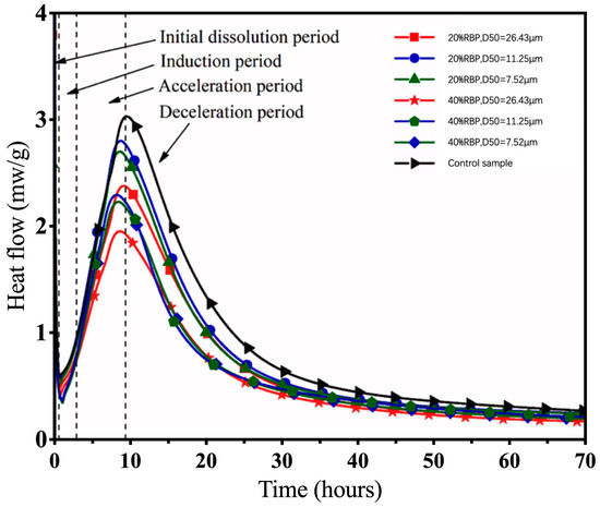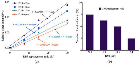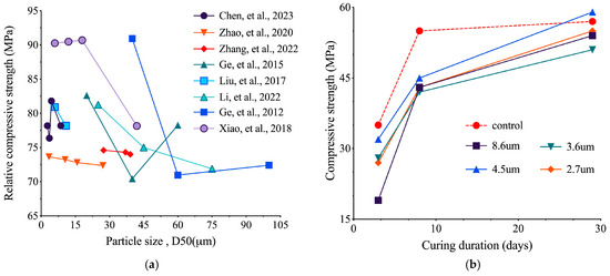 Generally, waste bricks are crushed and used as an aggregate in concrete, particularly for low-grade roadbeds. Silva et al. [15] indicated that recycled masonry aggregates (RMAs) can be applied in rubble mound breakwaters, highway sub-bases, and other similar applications. They also argued that RMAs have the potential to economically replace NAs in numerous applications. However, recycled aggregates sourced from waste bricks are characterized by high water absorbency, low density, and weaker strength, which significantly reduce the overall performance of concrete. Consequently, its applications are limited to non-load-bearing purposes [16,17]. In contrast, Wong et al. [18] suggested that the utilization of recyclable brick powder (RBP) derived from grinding waste bricks is more advantageous for recycling and offers a broader range of application scenarios than waste brick aggregates. Thus, as shown by Xue et al. [19], RBP has a pronounced effect on the mechanical performance of cementitious materials at a replacement rate of 10–20%. Limpanuparb [20] showed that the compressive, flexural, and tensile strengths of cementitious materials containing 10% RBP were enhanced by 14.78%, 12.87%, and 17.96%, respectively. This enhancement is attributed to the pozzolanic activity of RBP [21], which is generated by the high-temperature calcination and rapid cooling process during brick making, which converts clay minerals in bricks into amorphous silica-aluminate [10]. Additionally, Kırgız [5] suggested that all types of brick powders exhibit pozzolanic activity, which enhances the properties of cement. However, RBP primarily functions as a micro-aggregate filler during the initial stages of hydration and its pozzolanic activity is predominantly influenced by particle size. These factors will result in problems such as a low early strength of cementitious materials and constraints on the maximum replacement rate [22,23].