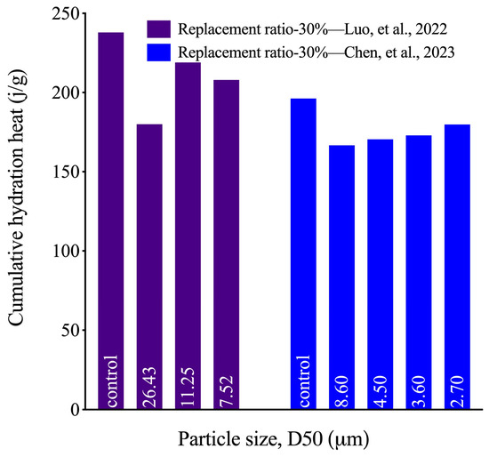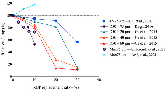 Median diameter (D50) for RBP and Portland cement (data derived from [10,40,44,45,46]).