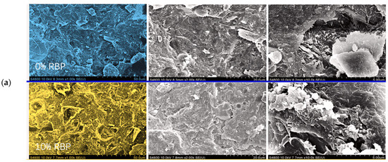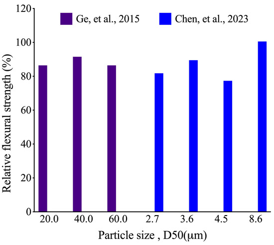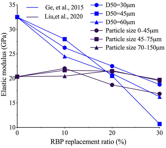 Table 4 illustrates the physical properties of typical unprocessed RBP. The density of RBP normally ranges from 2.52 to 2.67 g/cm3, while some researchers reported a lower density of only 1.25 g/cm3 [42]. Furthermore, as the diameter of the RBP decreases, there is an increase in the specific surface area (SSA) and pozzolanic activity [6]. Figure 3 summarizes the D50 values reported in the literature for RBP and Portland cement (PC). The RBP’s mean particle size distribution is 8.6 μm, with maximum and minimum values of 18.86 and 2.7 μm, respectively. However, some researchers have reported higher value of 65.28 μm [40]. In contrast, Portland cement has a low dispersion of particle sizes, and the mean value of the distribution is 12.2 μm, which is slightly higher than the average RBP particle size. The SSA of RBP is strongly correlated with its mechanical properties in cementitious materials. For instance, Ben Abbou et al. [40] reported an about 4.1% increase in the 7-day compressive strength of mortar containing 5% RBP with SSA of 390 m2/kg–520 m2/kg. Zhao et al. [43] pointed out that when the SSA of RBP increased from 253.3 m2/kg to 795.4 m2/kg, the compressive strength of mortar containing 30% RBP increased by about 4.7% and 18.6% at 7 days and 90 days, respectively.