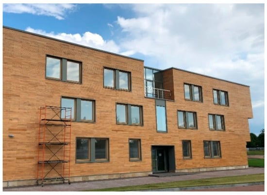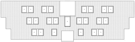 According to the technical manual, a suspended façade system has vertical and horizontal rails and brackets made of galvanized steel. Dowels are used to fix them to the walls. Building walls are insulated with 150 mm-thick non-combustible mineral wool, fixed by disk-shaped dowels. Timber panels made of pine planken, 1200 × 160 × 20 mm each, serve as cladding elements. The panels are fastened to the substructure by galvanized self-tapping screws made of corrosion-resistant steel. Façade cladding is made of timber panels; the architectural design of the façade is shown in Figure 2. The suspended façade and fixing systems are shown in Figure 3. Window and door casing elements are made of galvanized steel to ensure fire safety.