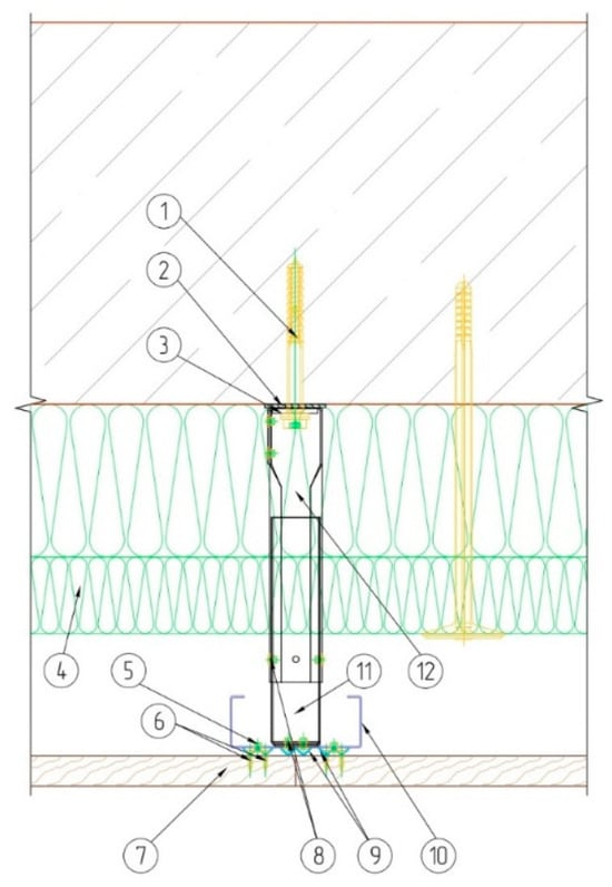 The suspended façade fastening system: 1—fastening anchor, 2—paronite gasket, 3—washer, 4—mineral wool insulation, 5—rivet, 6—self-tapping screw, 7—pine planken, 8—rivet, 9—planken fastener, 10—vertical rail, 11—bracket extension, 12—bracket.