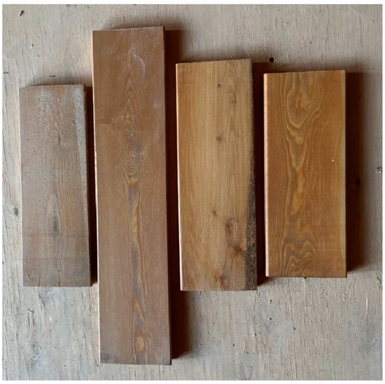 Four pine planken specimens, (350–500) × 160 × 20 mm each, were extracted from different parts of the façade cladding, repaired in 2018. Technical manuals have no information about the fire retardant, its application methods, and effective period. Hence, the task of the research is to check the effectiveness of the timber façade fireproofing and the method of the fire-retardant application. The external view of the planken specimens, used for testing purposes, is shown in Figure 4.