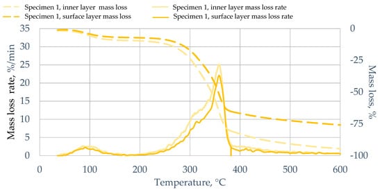 As it follows from the dependencies, shown in Figure 5 for specimen 1surface and specimen 1inner, the maximum mass-loss rate was recorded at a temperature of 360 °C. Values of (1) the rate of mass loss and (2) the total mass loss in the material of the inner layer of a planken board approach values characteristic of untreated timber, while residual coke and the total mass loss in the surface layer is much lower, which suggests the presence of inorganic non-combustible impurities in the specimen, such as cement dust, identified in the course of the initial visual inspection of the specimens.