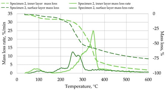 The surface layer of specimen 2 shows a large shift in temperature and the maximum mass-loss rate (261 °C) during thermal decomposition. The maximum mass-loss rate in the surface layer is two times lower than that in the inner layer, and the residual coke in the surface layer is 1.8 times larger than the residual coke in the inner layer, which indicates the presence of a flame retardant applied by the method of surface treatment (impregnation).