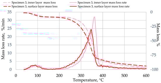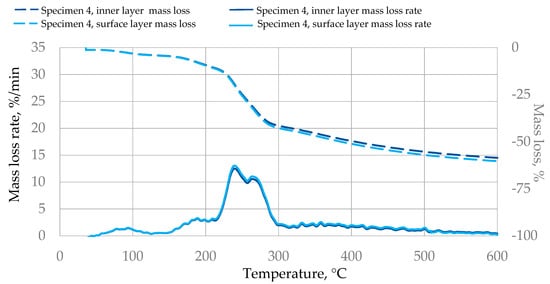 The surface and inner layers of specimen 4 demonstrate a great shift in temperatures of the maximum mass-loss rate (241–245 °C), with the maximum mass-loss rate itself being more than two times lower than that in untreated timber, and with residual coke in both layers being 1.8 times higher than that in unprotected timber, indicating the presence of a flame retardant applied using the pressure impregnation method [].