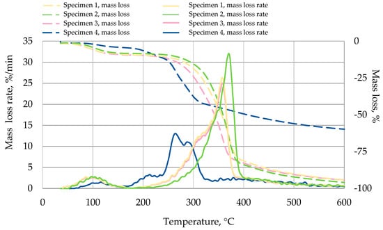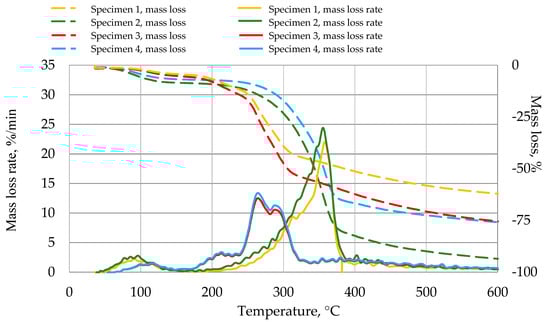 The analysis of the thermogravimetric study of timber specimens 1–4 (Figure 5, Figure 6, Figure 7, Figure 8, Figure 9 and Figure 10), shows that timber decomposes in the following temperature ranges: