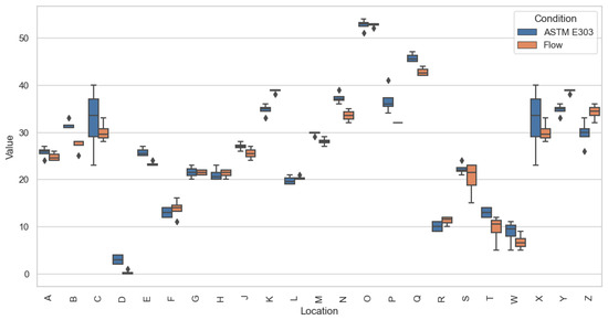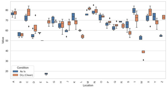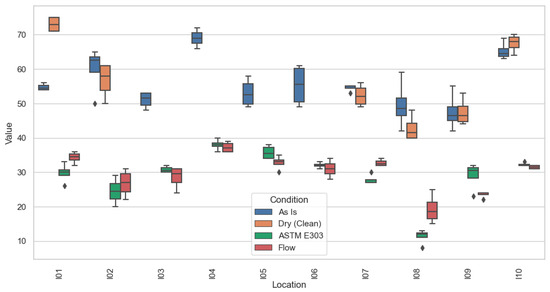 Figure 7. The box plots show that at some locations, the observations are consistently closer to the central tendency, whereas at other locations it varies largely. In some locations, the spread is also wide indicative of a higher variability of the BPN values. Therefore, locations with high medians and narrower spreads can be considered as high-performing surfaces. Interestingly, these observations also show the most consistency in the observations for wet conditions using water flow during testing, followed by the observations made using the ASTM E303 method. Variability during as-is surface conditions and once the surface is cleaned and dried are similarly sporadic.