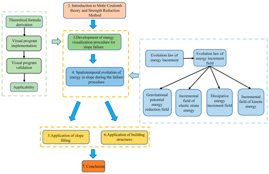 The aim of this paper is to develop a calculation program with energy field visualization and analyze the slope failure mechanism and assess building structure safety from the perspective of energy visualization. Firstly, based on the thermodynamic principle, the energy calculation principle for slopes is derived. Secondly, the finite difference method program FLAC3D7.0 is secondarily developed to write an energy visualization program applicable to the study of the slope instability process. Then, the program is verified in a classical two-dimensional slope model, the energy evolution laws during the slope failure process are analyzed, the corresponding relationships between different stages of energy evolution and different stages of traditional slope stability analysis are sought, and the slope failure mechanism is revealed. Finally, combined with two practical projects, the comparison and optimization of filling schemes and the stability analysis before and after slope reinforcement are carried out, and the safety analysis of building structures in the construction and operation stages is performed to prove the applicability of the program in practical projects. The research technical route is shown in Figure 1, where the technical roadmap clearly outlines the steps and procedures for this project.
